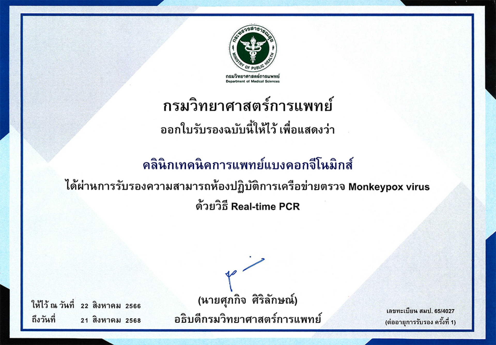 ห้องปฏิบัติการคลินิกเทคนิคการแพทย์แบงคอกจีโนมิกส์ ได้รับการต่ออายุใบรับรองความสามารถห้องปฏิบัติการเครือข่ายตรวจ Monkeypox virus จากกรมวิทยาศาสตร์การแพทย์ กระทรวงสาธารณสุข ในวันที่ 22 สิงหาคม 2566