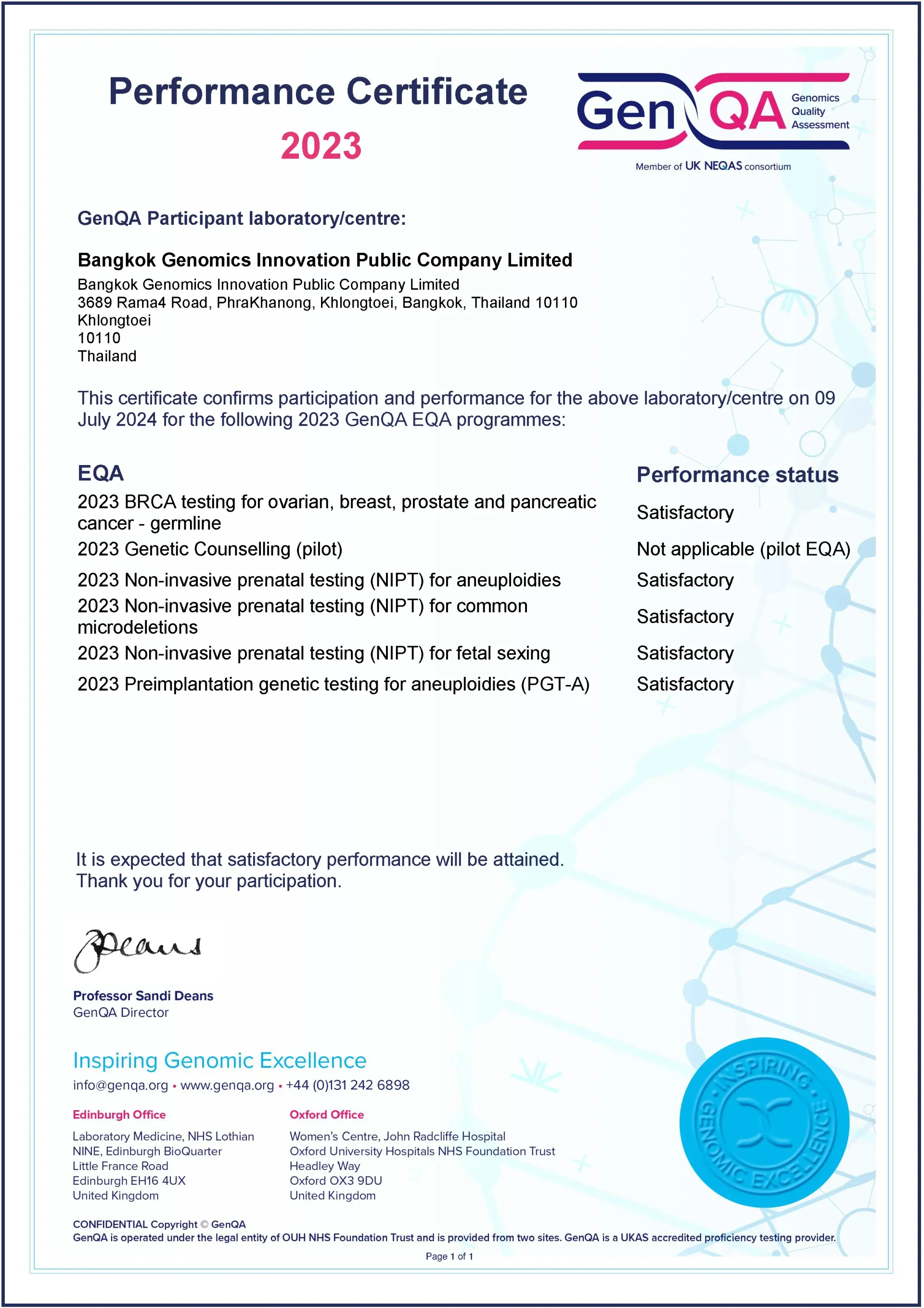 ห้องปฏิบัติการคลินิกเทคนิคการแพทย์แบงคอกจีโนมิกส์ ได้เข้าร่วมโปรแกรมประเมินความสามารถห้องปฏิบัติการจากองค์กรภายนอก หรือ External Quality Assesment กับหน่วยงาน GENQA (Genomic Quality Assesment) (US NEQAs)