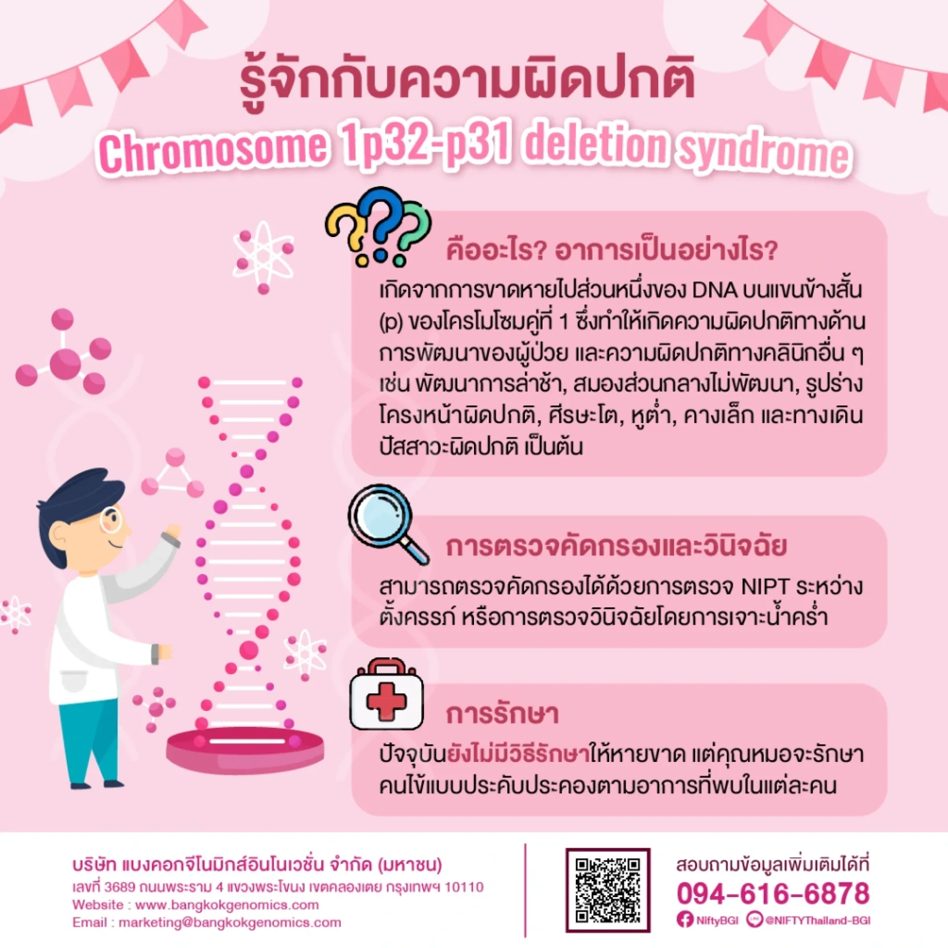 นิฟตี้เชื่อว่าการแบ่งปันความรู้เกี่ยวกับความผิดปกติทางพันธุกรรมจะเป็นประโยชน์ต่อคุณพ่อคุณแม่ วันนี้แอดมินจะมาเสนอข้อมูลเกี่ยวกับโรค Chromosome 1p32-p31 deletion syndrome ซึ่งเป็นโรคทางพันธุกรรมหายากที่มีโอกาสพบได้ในทารกแรกเกิดทั่วโลก