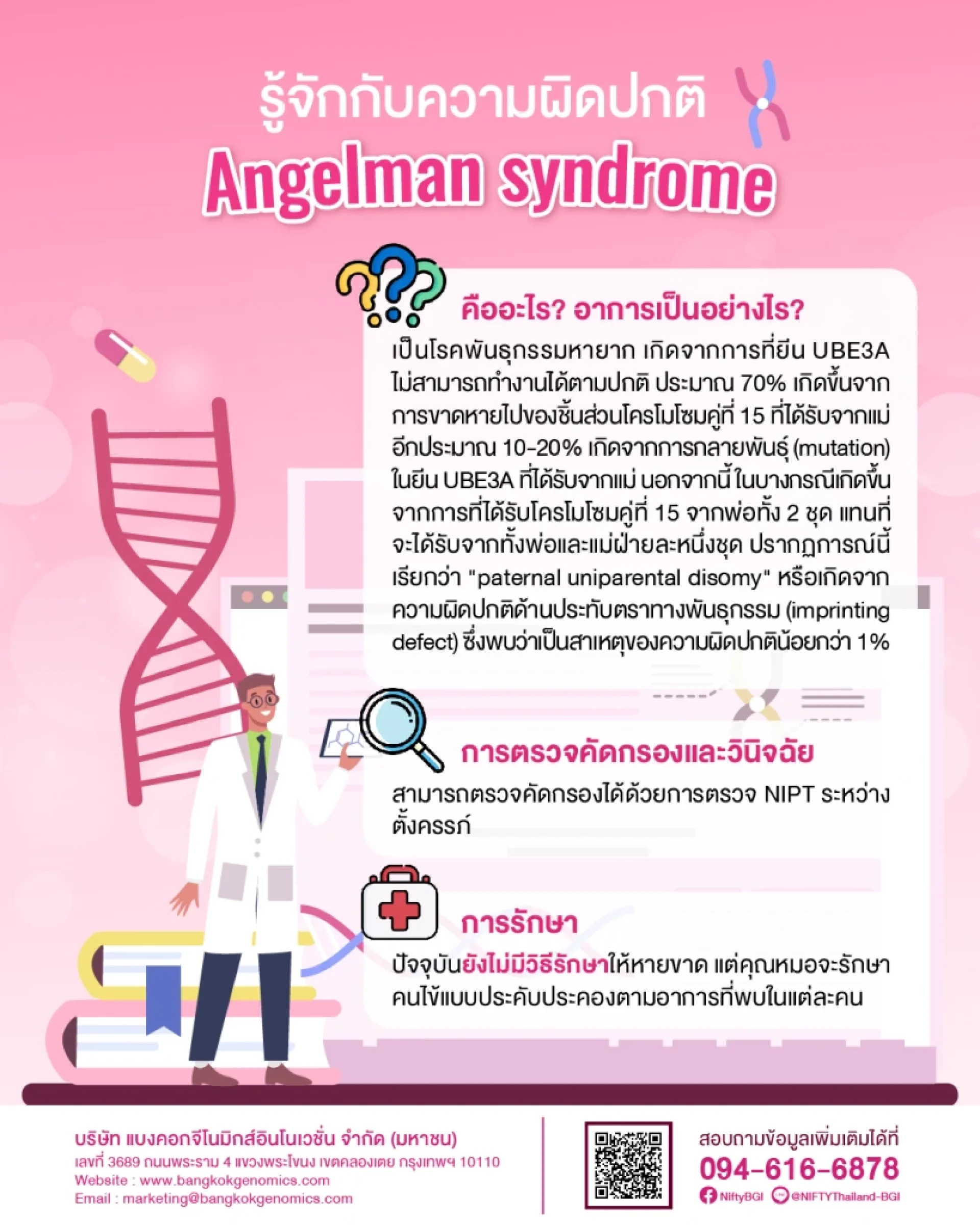 Angelman syndrome ที่เกิดจากการขาดหายไปของชิ้นส่วนโครโมโซมคู่ที่ 15 สามารถตรวจคัดกรองได้ด้วยการตรวจ NIPT ระหว่างตั้งครรภ์ การวินิจฉัยโรคตั้งแต่เนิ่น ๆ ช่วยให้วางแผนการตั้งครรภ์ให้ดำเนินไปได้อย่างเหมาะสม และอาจรวมถึงการวางแผนการรักษาที่เหมาะสมอีกด้วย