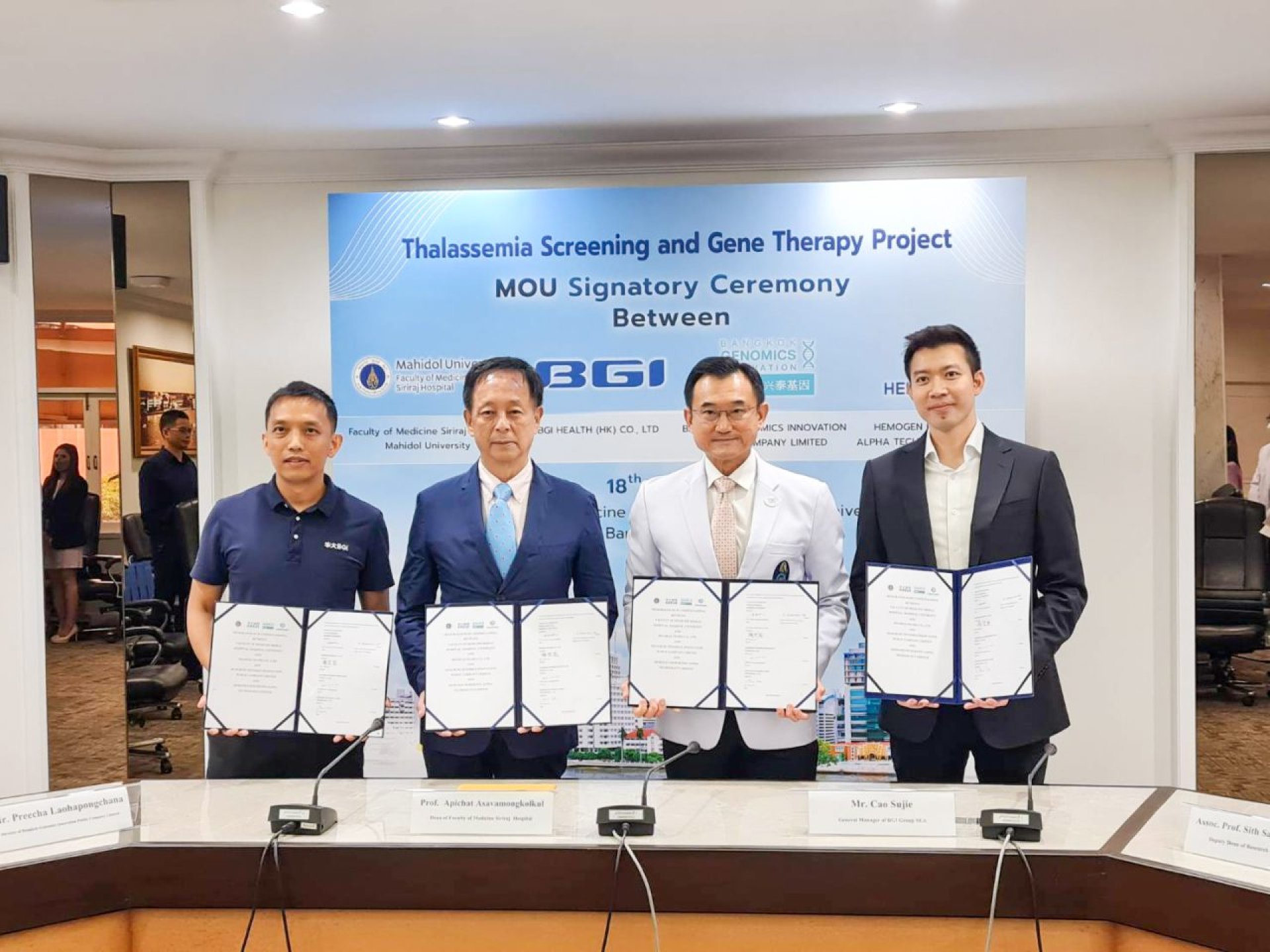 เมื่อวันที่ 18 กรกฎาคม 2566 บริษัท แบงคอกจีโนมิกส์อินโนเวชั่น จำกัด (มหาชน) ร่วมมือกับ คณะแพทยศาสตร์ศิริราชพยาบาล มหาวิทยาลัยมหิดล และ BGI Health (HK) Co.,Ltd. และ Hemogen Hongkong Alpha Technology Limited จัดพิธีลงนามในบันทึกข้อตกลงความร่วมมือด้านการพัฒนาการป้องกันและรักษาโรคธาลัสซีเมีย โดยมี นายปรีชา เลาหพงศ์ชนะ กรรมการบริษัทฯ, ศ.นพ.อภิชาติ อัศวมงคลกุล คณบดีคณะแพทยศาสตร์ศิริราชพยาบาล มหาวิทยาลัยมหิดล, Mr. Ning Li กรรมการบริษัท BGI Health (HK) Co., Ltd. และ Dr. Chao LIU ประธานเจ้าหน้าที่บริหาร Hemogen Hongkong Alpha Technology Limited ร่วมเป็นสักขีพยานพิธีลงนามในครั้งนี้