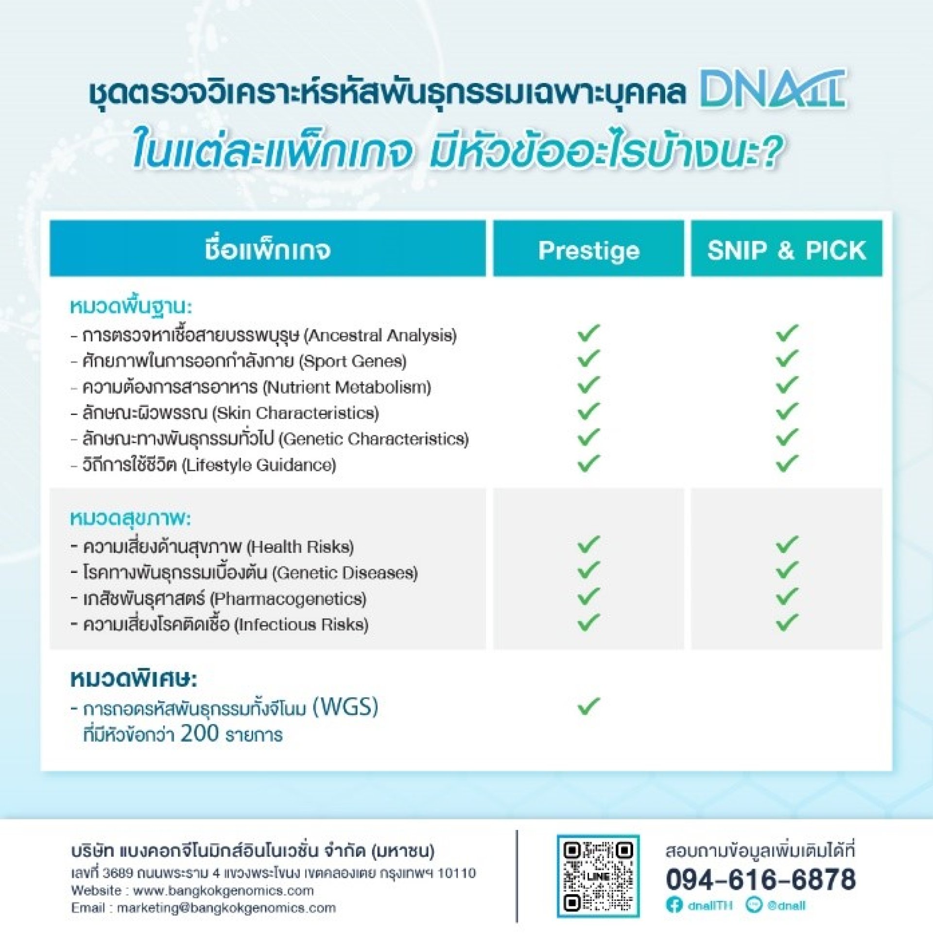 ชุดตรวจวิเคราะห์รหัสพันธุกรรมเฉพาะบุคคล DNALL ในแต่ละแพ็กเกจ มีหัวข้ออะไรบ้าง