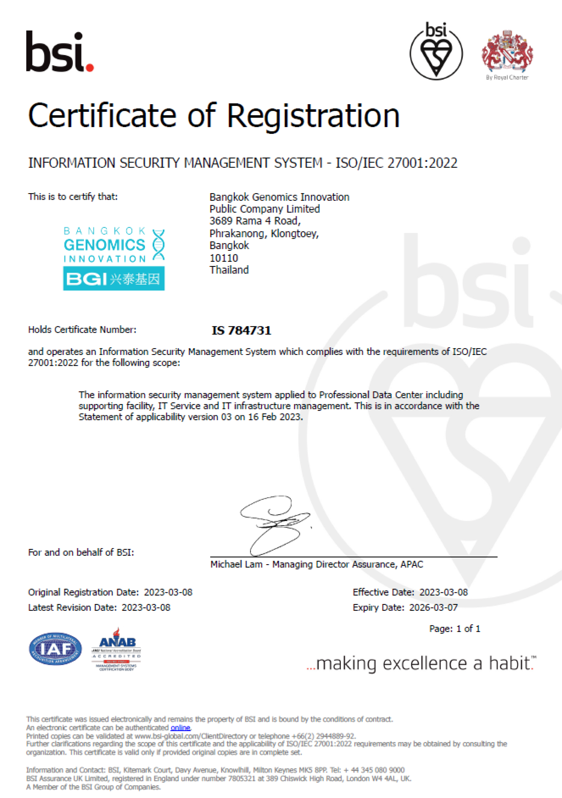 บริษัท แบงคอกจีโนมิกส์อินโนเวชั่น จำกัด (มหาชน) ได้รับการรับรองมาตรฐานระบบบริหารจัดการความมั่นคงปลอดภัยสารสนเทศ ISO/IEC 27001:2022 (Information Security Management Systems: ISMS) จากบริษัท บีเอสไอ กรุ๊ป (ประเทศไทย) จำกัด ซึ่งถือเป็นบริษัทต้นๆ ในด้านธุรกิจห้องปฏิบัติการ ในประเทศไทยที่ได้รับการรับรองมาตรฐาน ISO/IEC 27001:2022 นับเป็นการตอกย้ำให้เห็นว่า บริษัทฯ เน้นเรื่องความปลอดภัย ของข้อมูลลูกค้าและผู้มีส่วนได้ส่วนเสีย ให้มีความมั่นคงปลอดภัย และการปฏิบัติตามข้อกำหนด (Governance, Risk and Compliance) เราพร้อมจะเป็นกำลังสำคัญที่จะคอยสนับสนุน ในทุกๆด้าน และสร้างความเชื่อมั่นให้แก่ลูกค้าทุกภาคส่วนต่อไป