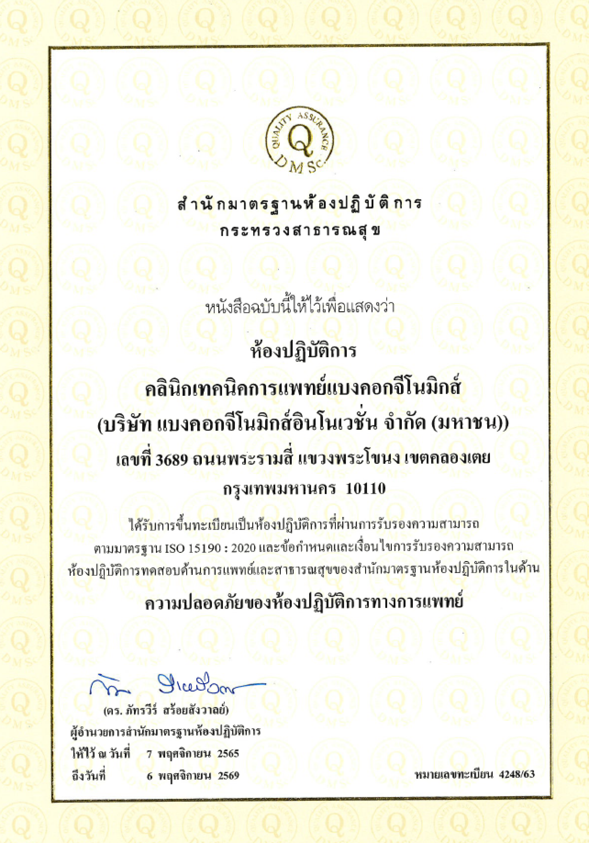 บริษัท แบงคอกจีโนมิกส์อินโนเวชั่น จำกัด (มหาชน) ได้รับการรับรองมาตรฐานความปลอดภัยห้องปฏิบัติการทางการแพทย์ จากสำนักมาตรฐานห้องปฏิบัติการ กรมวิทยาศาสตร์การแพทย์ กระทรวงสาธารณสุข ปี 2565